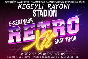 Búgin saat 19:00 de Kegeyli rayonında Ózbekstan mámleketlik filarmoniyası Qaraqalpaqstan Respublikası bóliminiń xosh hawaz qosıqshıları qatnasıwında «Retro-xıt» atamasında shou koncert baǵdarlaması bolıp ótedi.
