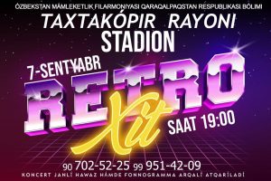 Búgin saat 19:00 de Taxtakópir rayonında Ózbekstan mámleketlik filarmoniyası Qaraqalpaqstan Respublikası bóliminiń xosh hawaz qosıqshıları qatnasıwında «Retro-xıt» atamasında shou koncert baǵdarlaması bolıp ótedi.