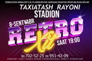 Búgin saat 19:00 de Taxıyatas rayonında Ózbekstan mámleketlik filarmoniyası Qaraqalpaqstan Respublikası bóliminiń xosh hawaz qosıqshıları qatnasıwında «Retro-xıt» atamasında shou koncert baǵdarlaması bolıp ótedi.