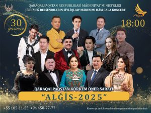 Barchangizni 30-yanvar kuni soat 18:00 da Qoraqalpog‘iston san’at saroyida bo‘lib o‘tadigan Qoraqalpog‘iston Respublikasi Madaniyat vazirligi tomonidan tashkil etilgan «Alg‘is – 2025» yilning eng faol madaniyat xodimlarini taqdirlash marosimi va gala konsertga taklif etamiz.