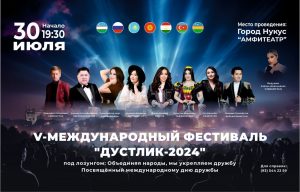 Барлық ўатанласларымызды 30-июль күни саат 19:30да «Халықлар дослығы күни» мүнәсибети менен пайтахтымыздағы орайлық амфитеатрда Россия, Қазақстан, Қырғызстан, Тәжикстан, Әзербайжан, Өзбекстан ҳәм Қарақалпақстан Республикаларының белгили қосықшылары қатнасыўында болып өтетуғын гала концертке мирәт етемиз.