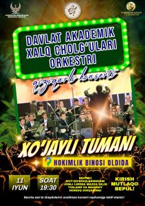 Усы жылдың 11-июнь күни саат 19:30да Хожели районында Мәмлекетлик академиялық халық сазлары оркестриниң концерт бағдарламасы болып өтеди.