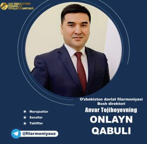 Ertaga 23-yanvar kuni soat 11:00dan 12:00ga qadar O‘zbekiston davlat filarmoniyasi Bosh direktori Anvar Tojiboyevning navbatdagi onlayn qabuli bo‘lib o‘tadi. Unda faoliyatga oid murojaatlar qabul qilinadi.